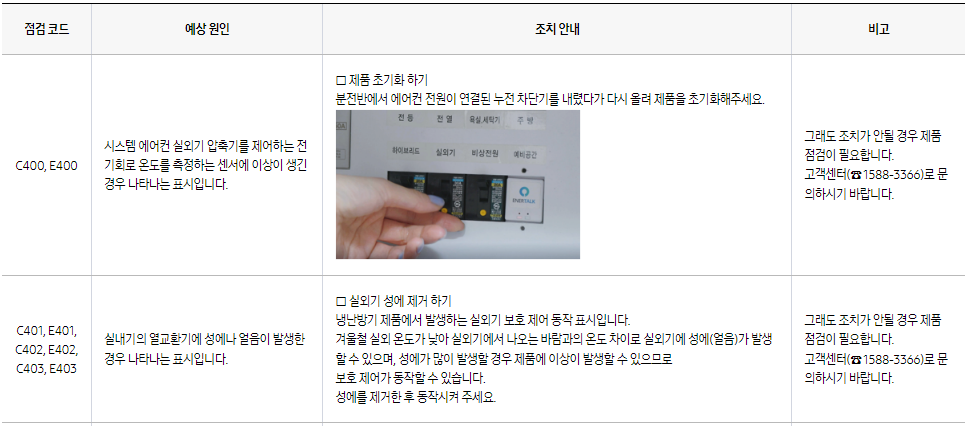 위에 해당 점검코드가 없으시면 아래 삼성에어컨 에러코드 400번대를 더 확인하시고