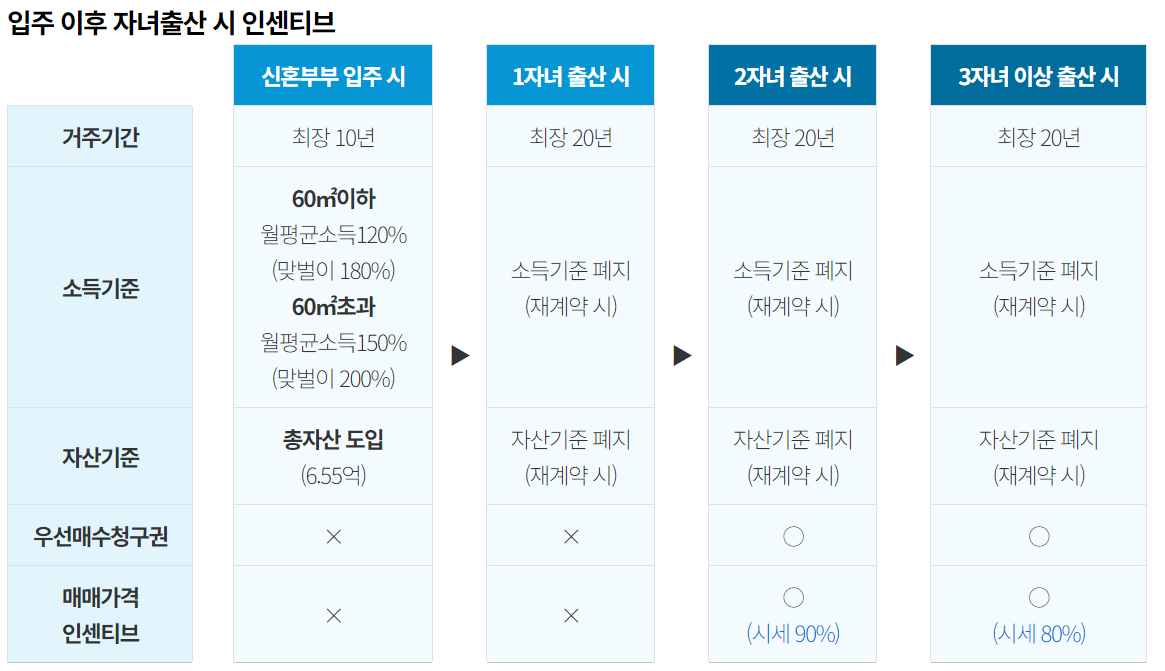 1자녀 출산가구에 대해 거주기간을 10년에서 20년으로 연장하고, 2자녀 이상 출산가구의 경우 해당 주택을 시세보다 최대 20% 저렴한 가격에 제공한다. 또한, 입주 이후 자녀 증가에 따라 세대원수가 증가하는 가구에 대해 입주 이후 10년차부터 더 넓은 평형으로 이주를 지원하며, 9년차부터 신청을 받을 예정이다.